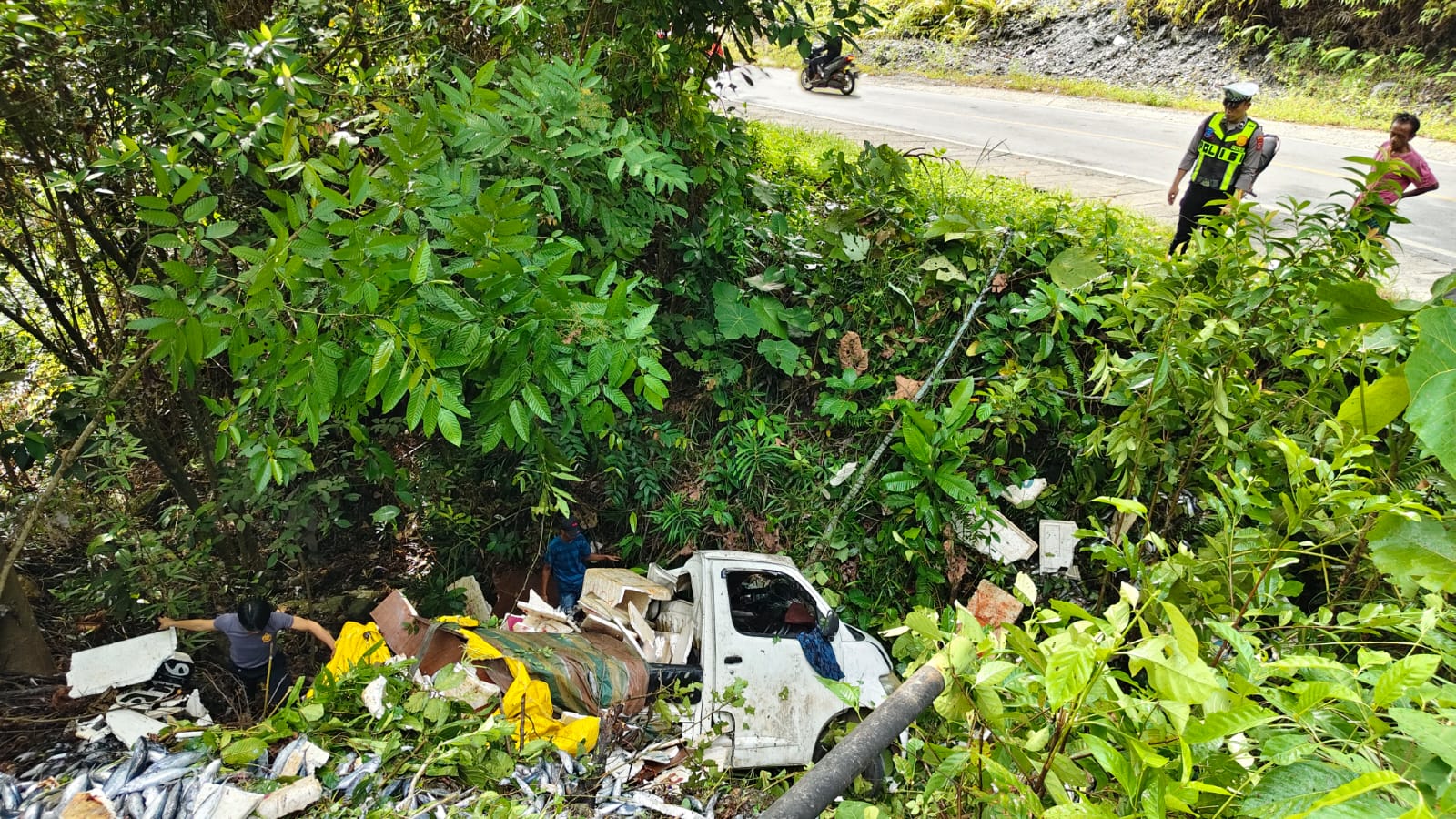 • Penyelamatan Korban: Personel turun langsung ke dalam jurang sedalam 7 meter untuk mengevakuasi pengemudi. Korban yang mengalami luka lecet di bagian muka segera diberikan pertolongan.