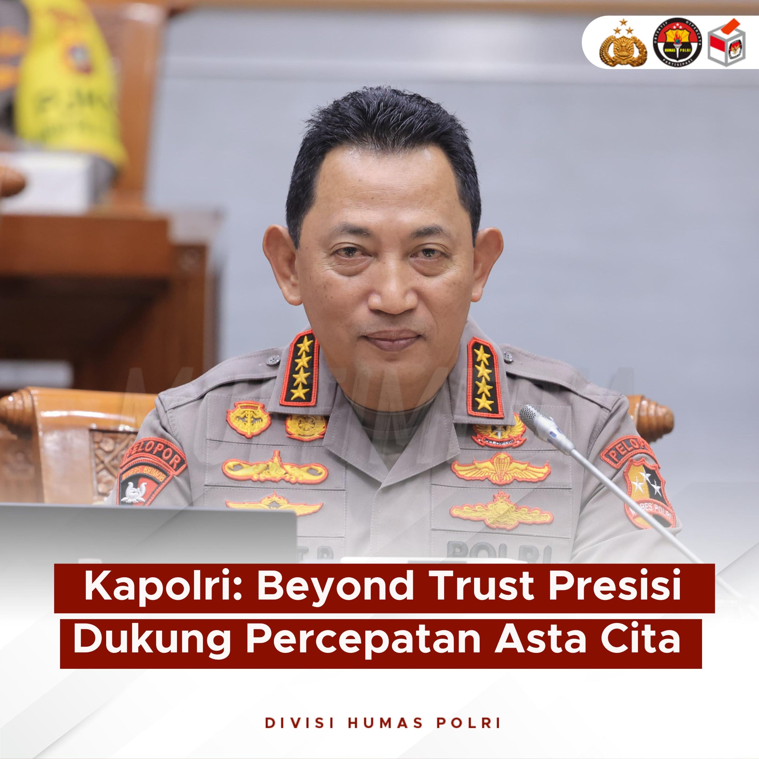 Kapolri menuturkan tujuan dari Beyond Trust Presisi adalah mewujudkan 8 misi Asta Cita, 17 program prioritas dan 8 program hasil terbaik cepat, yang terdiri dari 4 kebijakan, 7 program, dan 23 kegiatan.