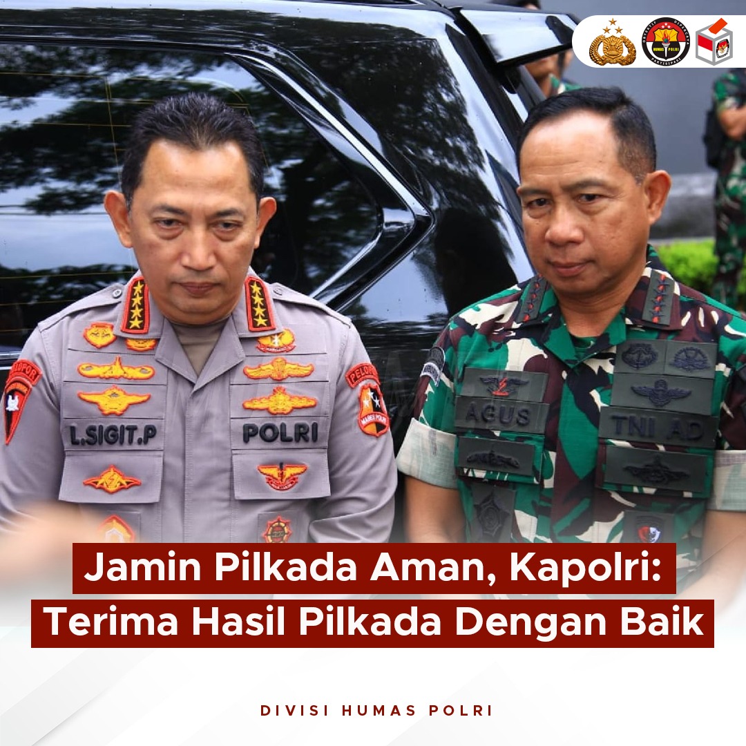 Kapolri, Jenderal Polisi Drs. Listyo Sigit Prabowo, M.Si., menegaskan komitmen Polri untuk memastikan pelaksanaan Pilkada serentak 2024 di seluruh Indonesia berlangsung aman, damai, dan kondusif. Dalam pernyataannya, Kapolri mengajak seluruh elemen masyarakat untuk mengedepankan persatuan dan kesatuan demi kelancaran pesta demokrasi yang menjadi wujud kebersamaan bangsa.