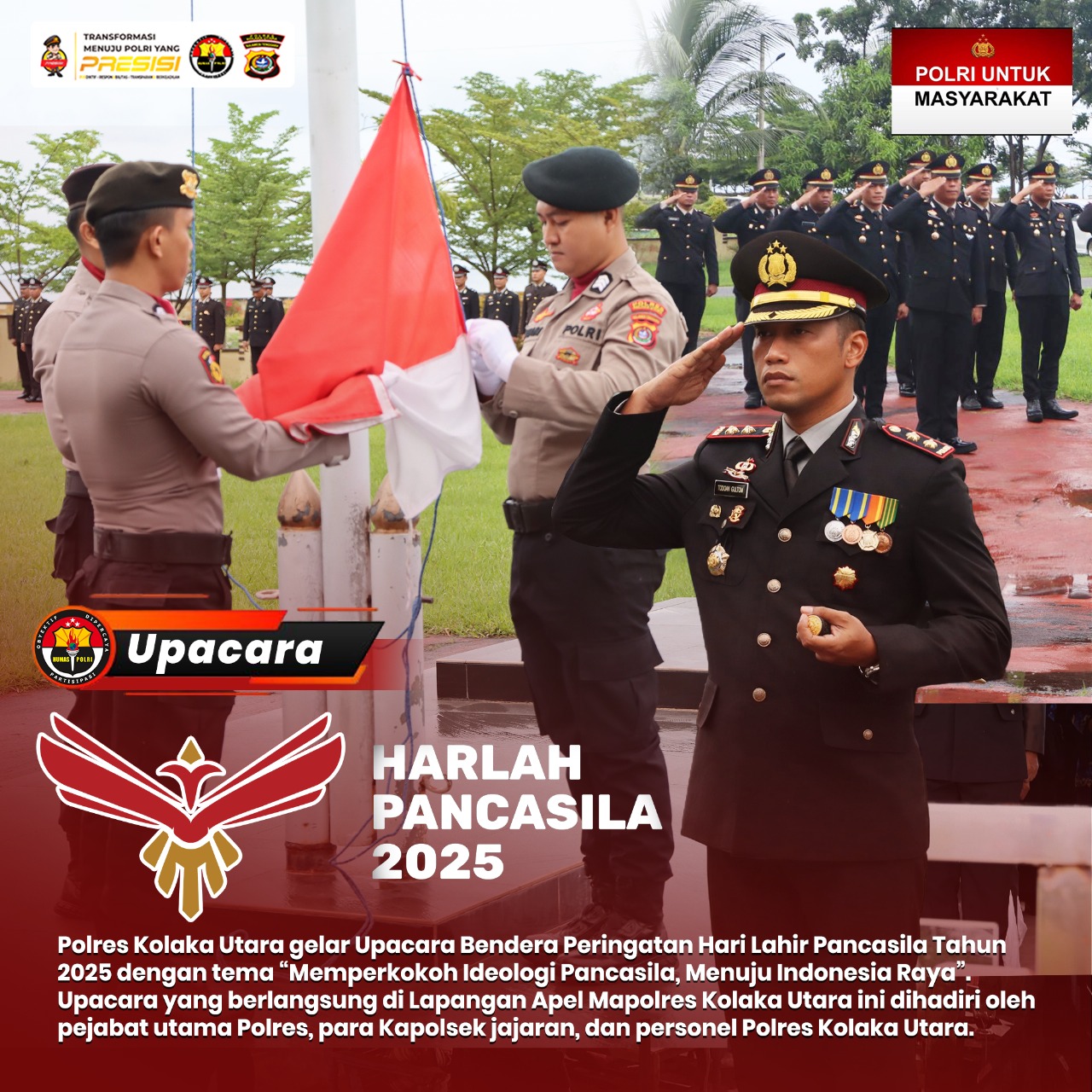 Kapolres Kolaka Utara AKBP R. Todoang A. Gultom, S.I.K., bertindak sebagai Inspektur Upacara dan membacakan amanat Kepala Badan Pembinaan Ideologi Pancasila (BPIP) Republik Indonesia. Dalam amanatnya, disampaikan bahwa Pancasila bukan hanya dokumen historis, tapi jiwa bangsa, pedoman hidup bersama, dan bintang penuntun menuju cita-cita Indonesia yang merdeka, bersatu, berdaulat, adil, dan makmur.