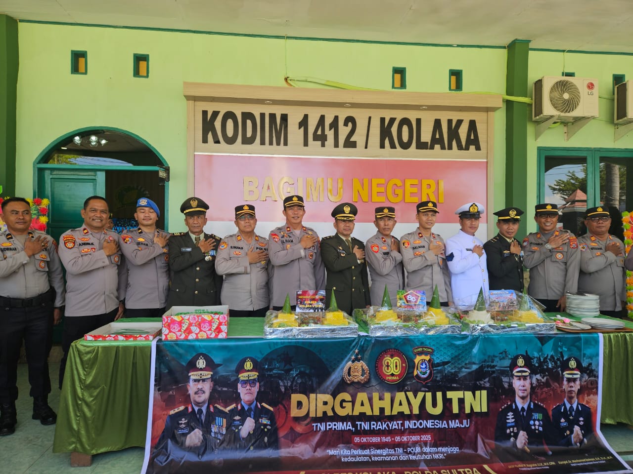Sebagai simbol kebersamaan dan rasa hormat, Polres Kolaka Utara, Polres Kolaka, dan Polres Kolaka Timur menyerahkan tiga buah tumpeng kepada pihak TNI yang diterima langsung oleh Kasdim 1412 Kolaka Mayor Inf. Mappatoba. Suasana hangat dan penuh kekeluargaan tampak mewarnai momen perayaan tersebut.